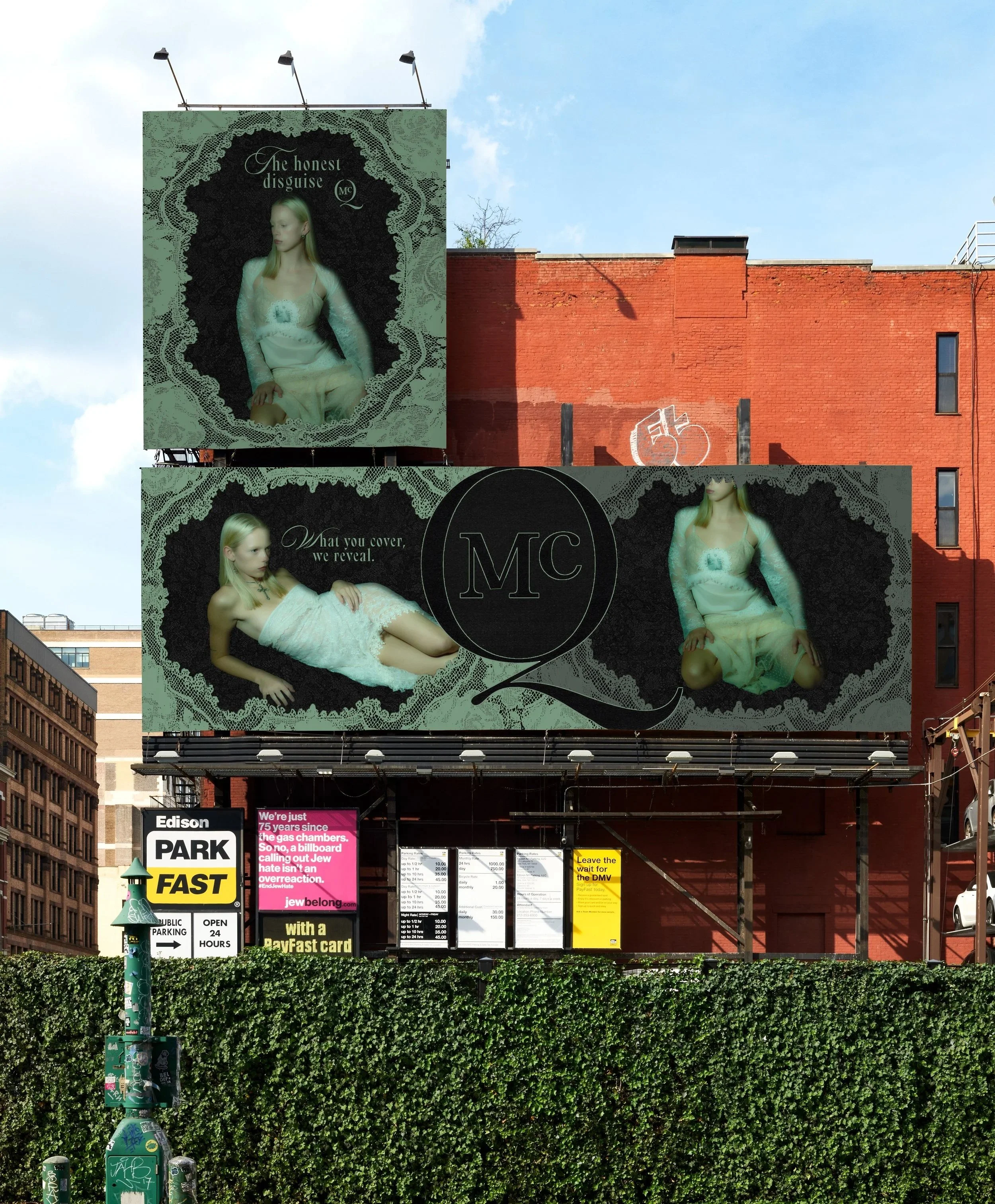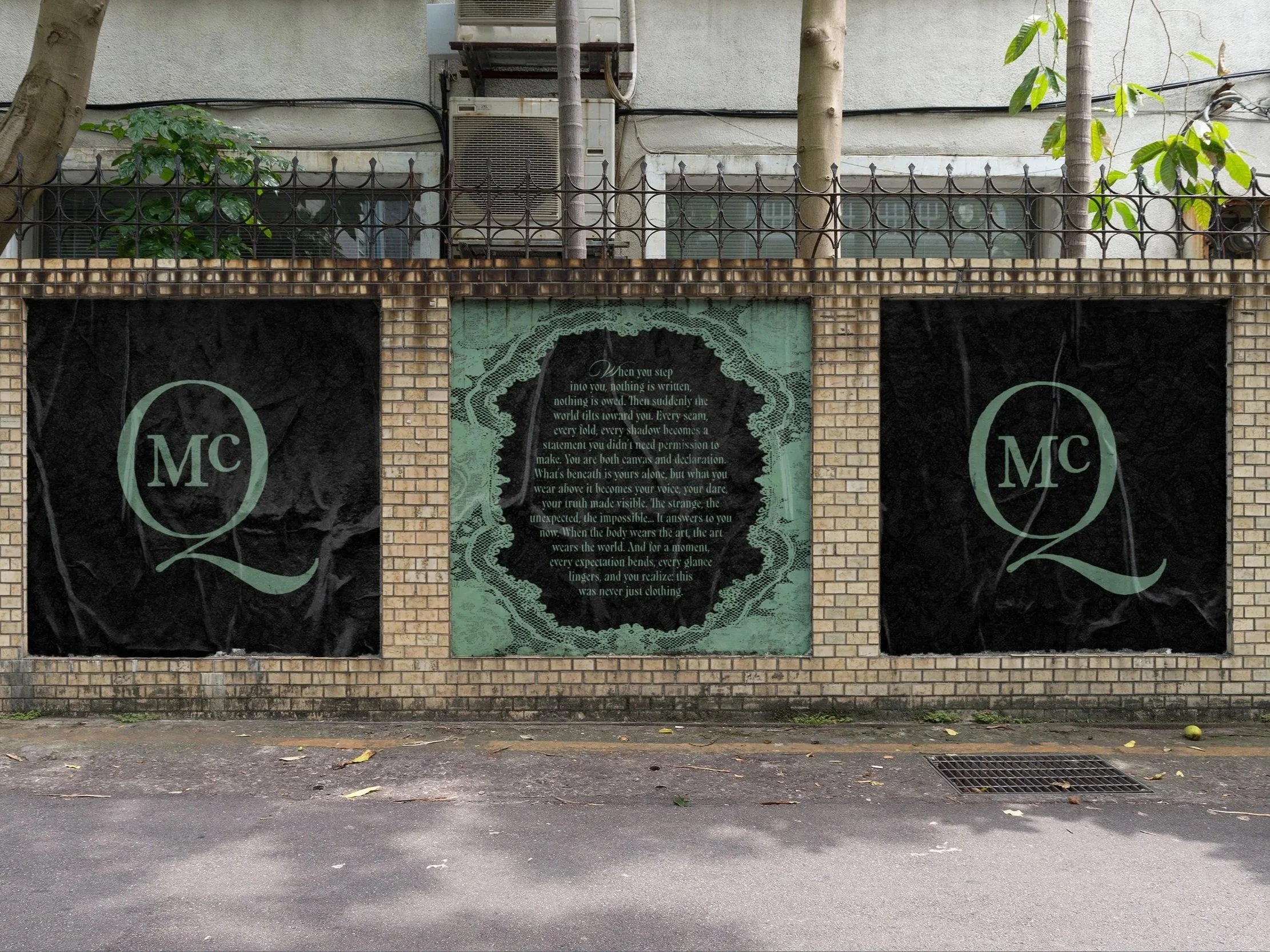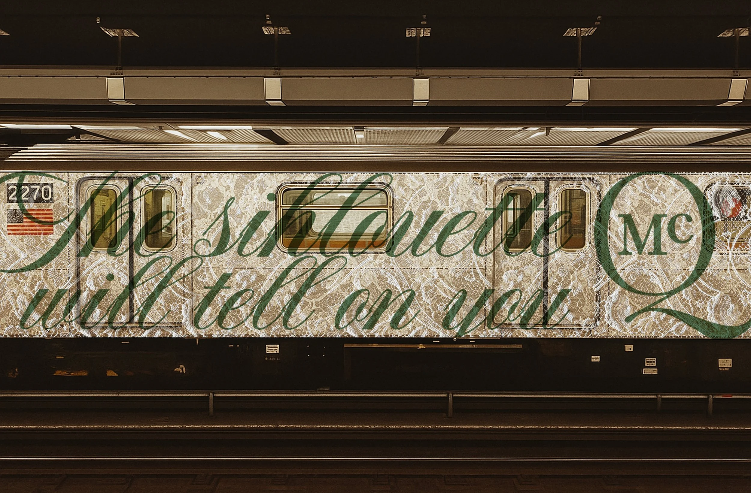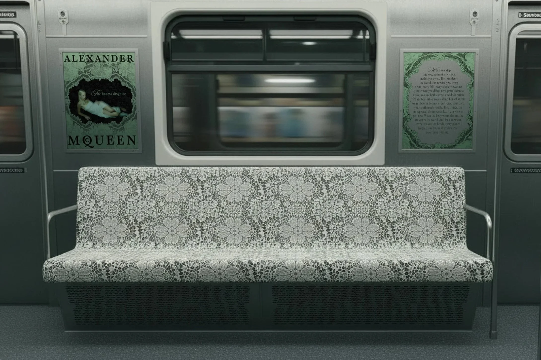 The subway car becomes a moving manifesto. Outside, black lace commands the streets. Inside, white lace glows, turning every surface into reflection. Passengers become part of it, reminded that what is covered carries its own power.