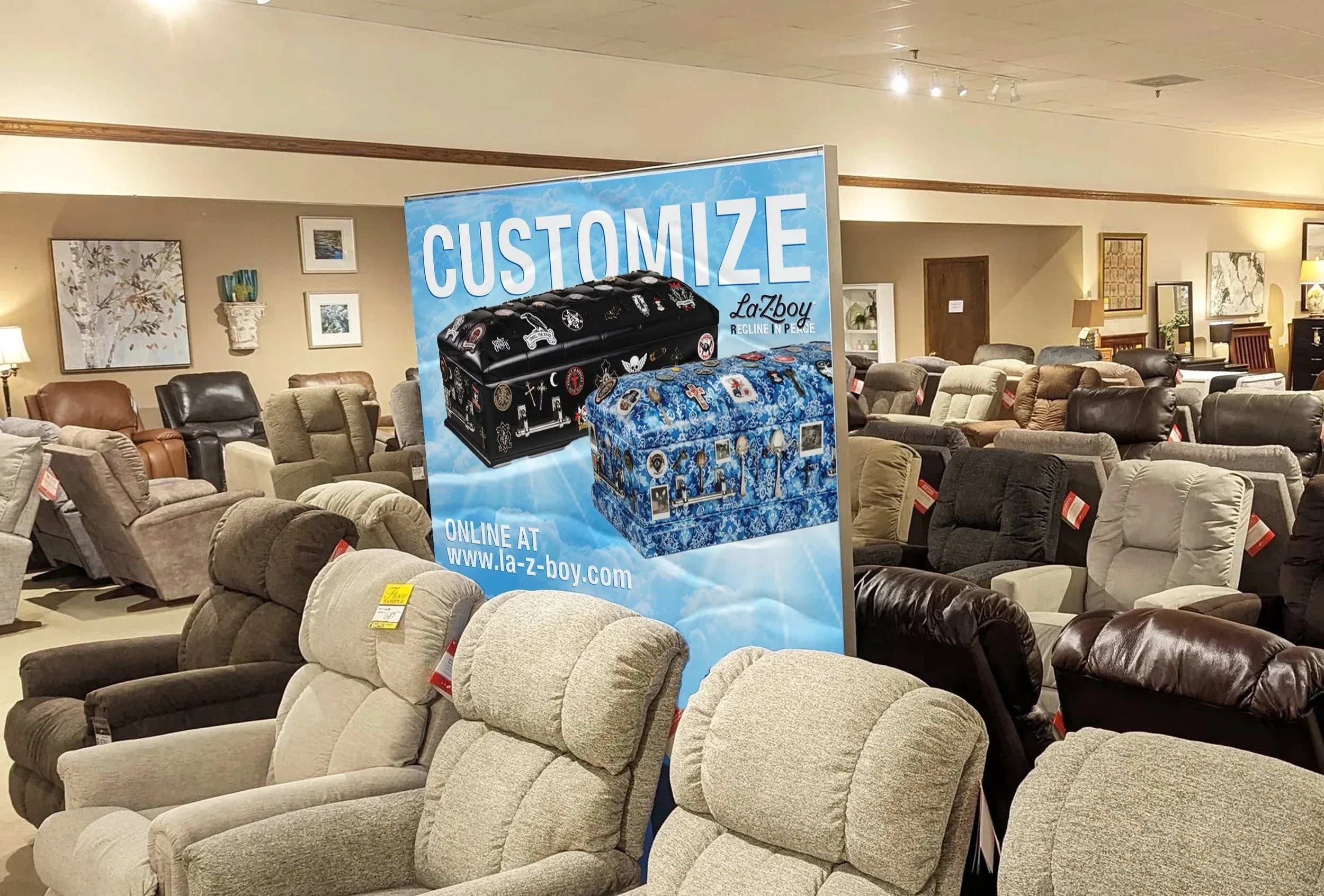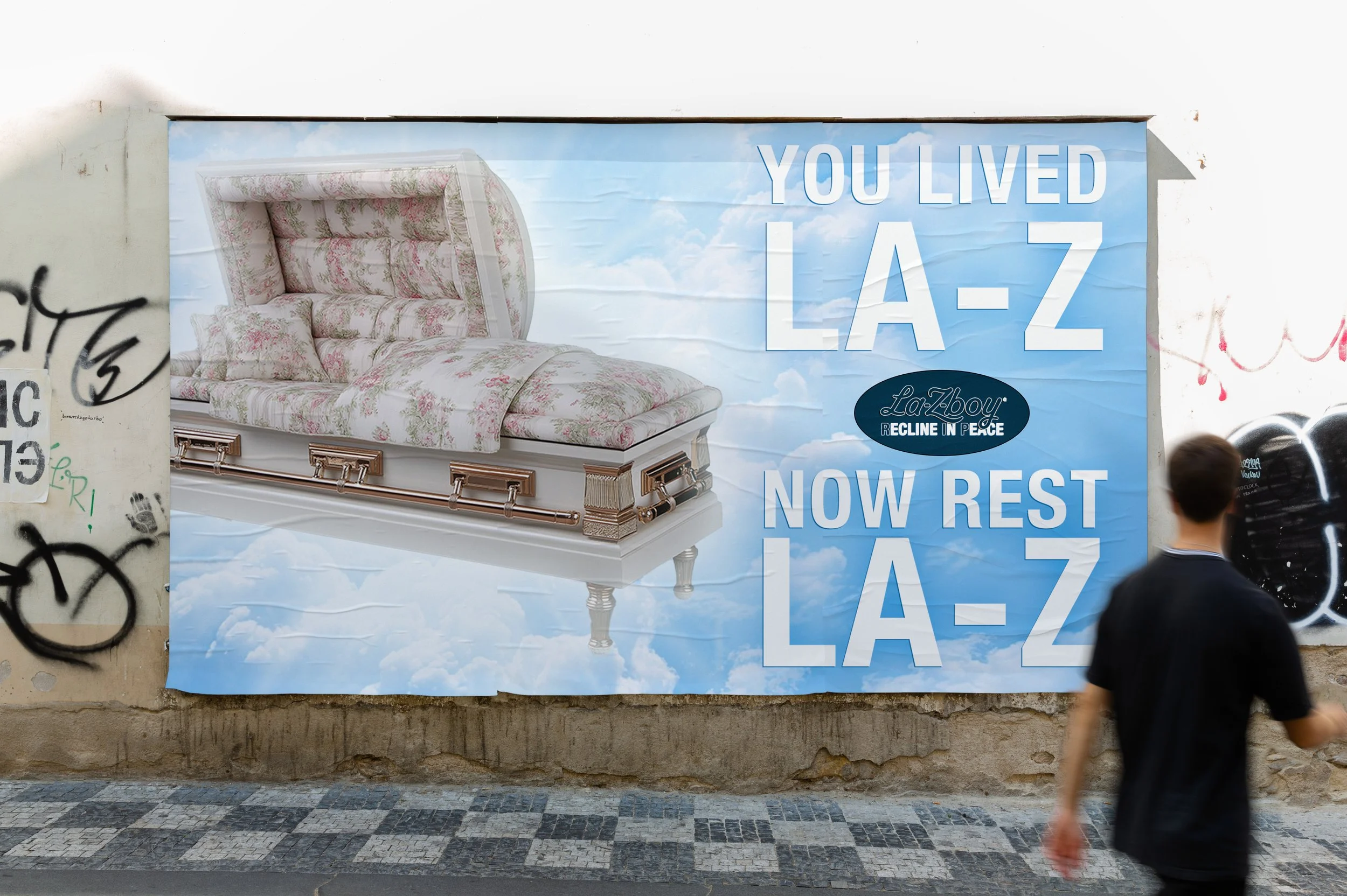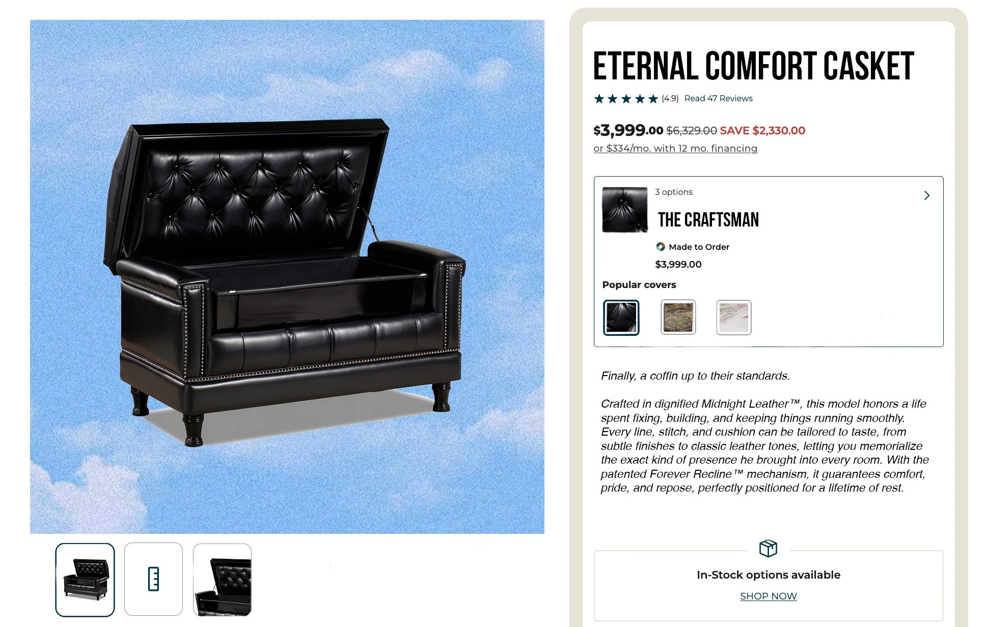 Some people love comfort so much they’ll pass on in a La-Z-Boy. For decades, we’ve perfected the art of putting your feet up, and now we’re putting them in the ground. Introducing: Eternal Comfort, La-z-boy’s first coffin. Fully customizable, seriously plush, and unapologetically eternal. Because at La-Z-Boy, comfort isn’t just a feeling, it’s forever.